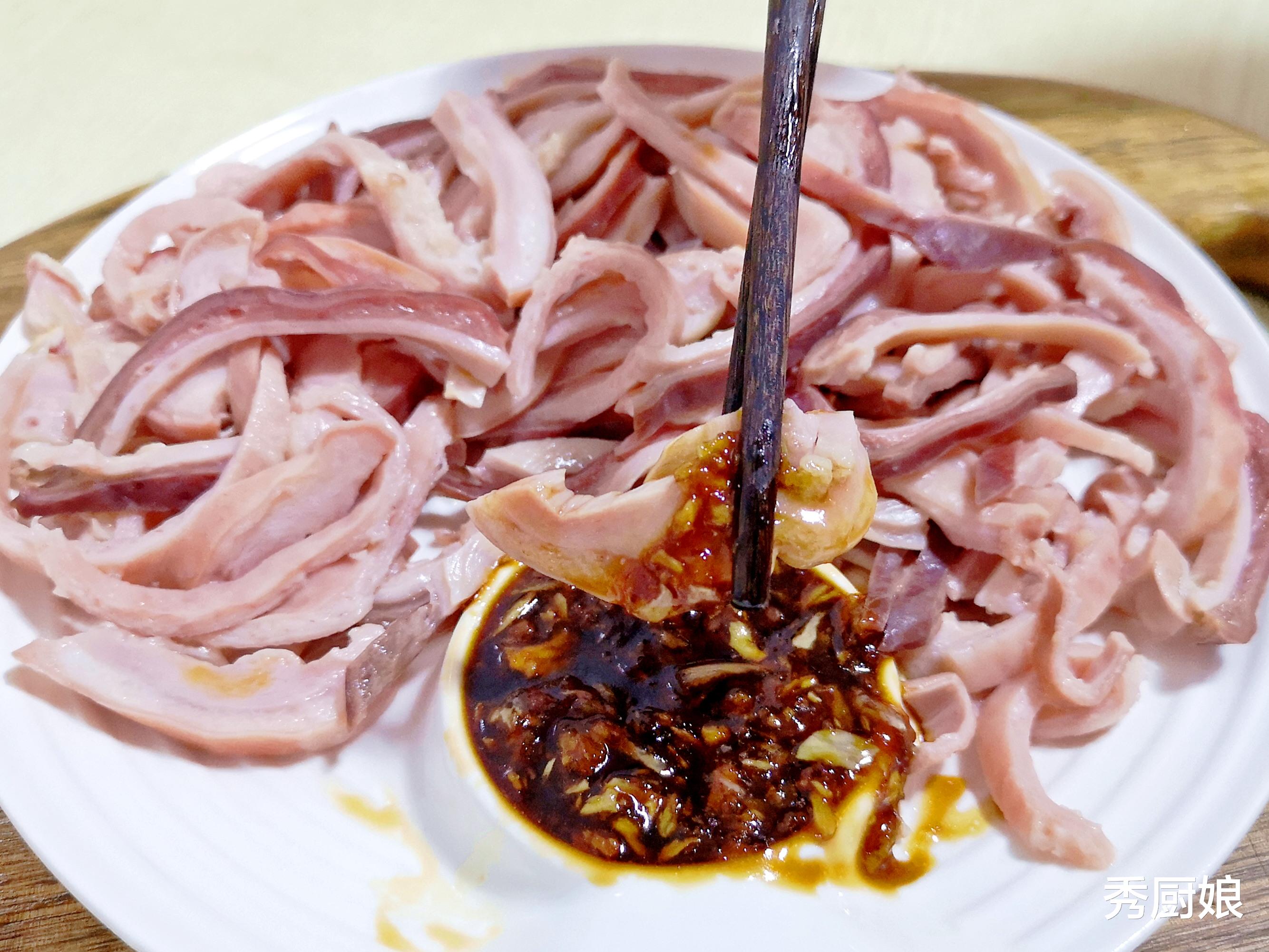4. 取出放凉后切成细丝,摆入盘中;捣点蒜泥,加生抽、一点点香醋、香油,喜欢辣的还可以放点辣椒油,调成蘸料。吃的时候夹一筷子肚丝,蘸满蒜泥料,又弹又嫩,一点也不腻,还特别开胃!