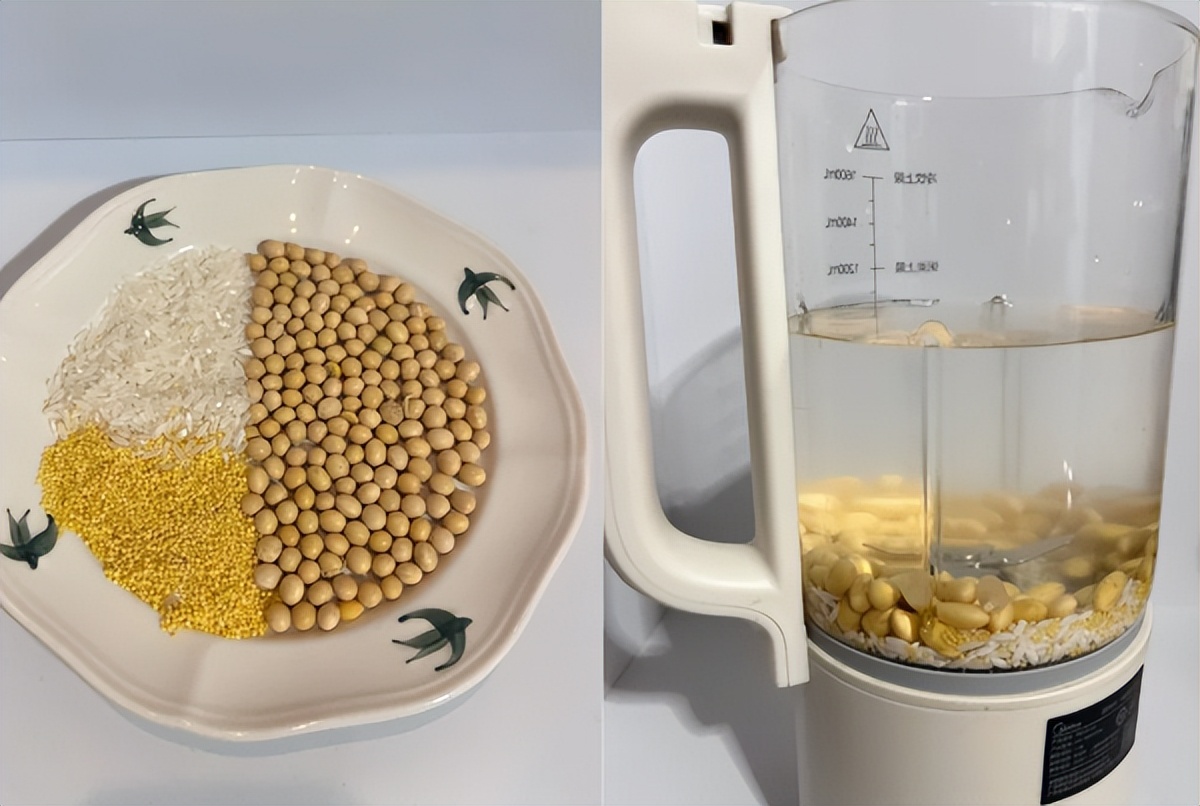 准备黄豆30g、茉莉花1g、小米10g、大米10g,把它们全都放入破壁机里面。