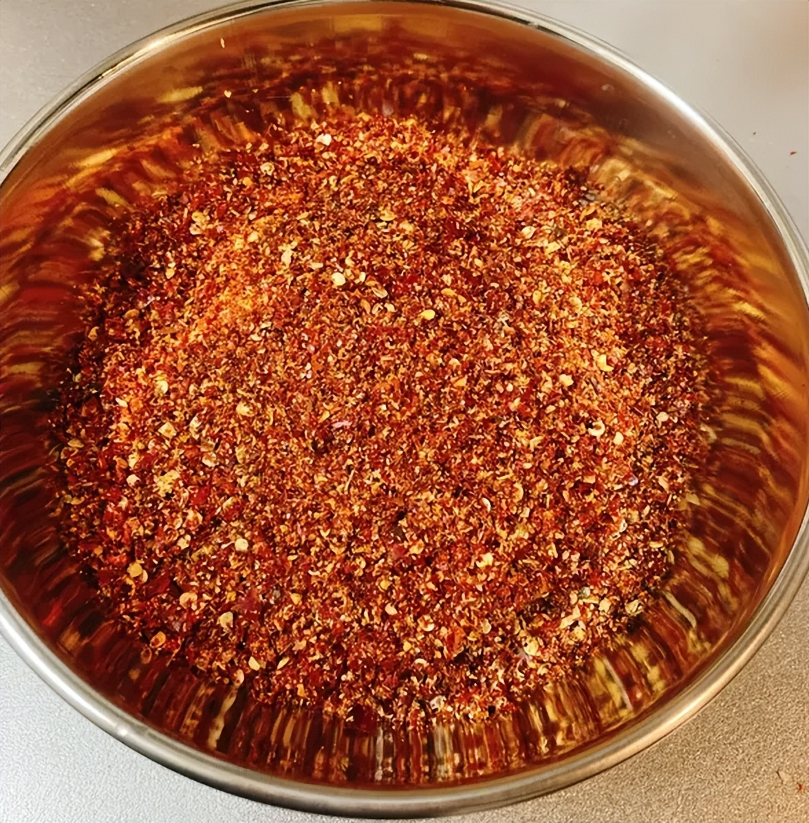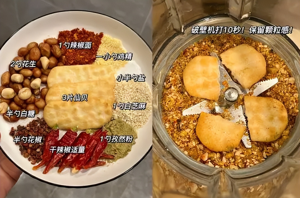 3片仙贝+2勺花生+1勺辣椒面+1勺白芝麻+一勺孜然粉+一小勺鸡精+半勺白糖+半勺花椒+小半勺盐+适量干辣椒 ,放入破壁机打10-30秒,按照自己口感选择粗细。