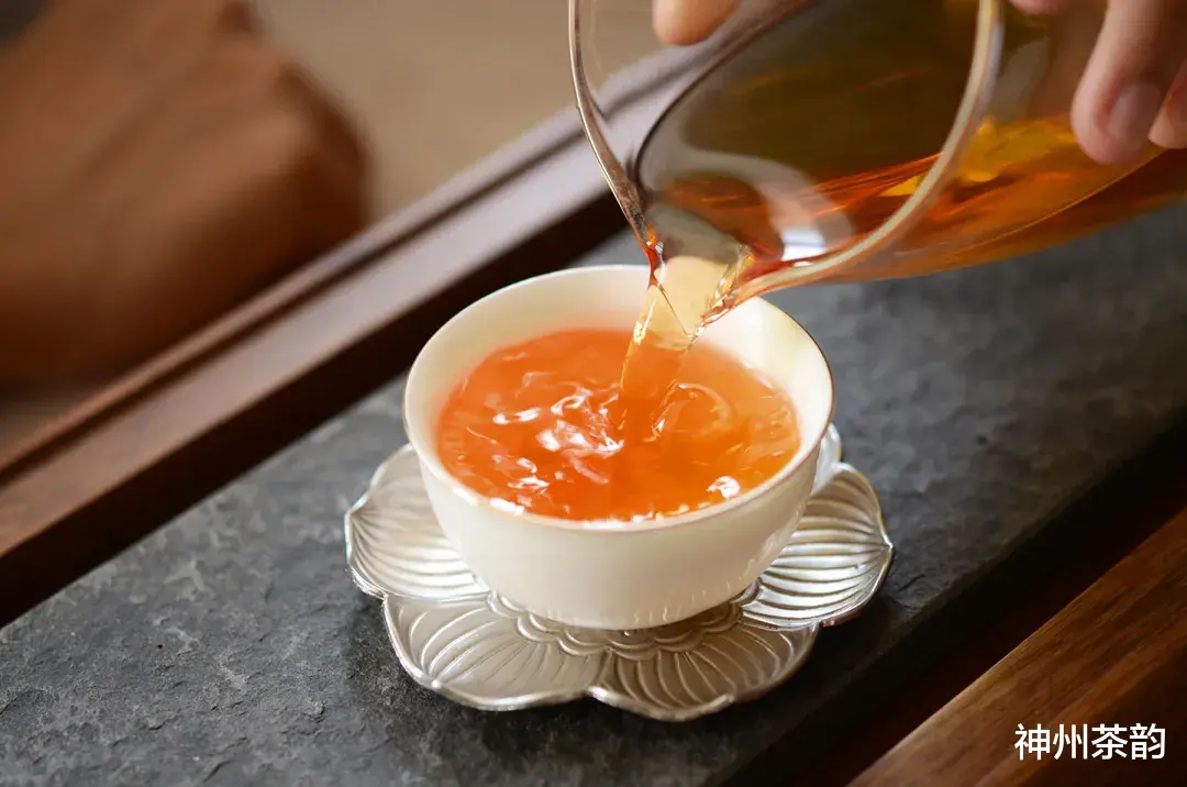 一泡淡金色,二、三泡后金黄带红润,三泡以后金黄透亮趋于稳定,十余泡尚黄透明亮。
