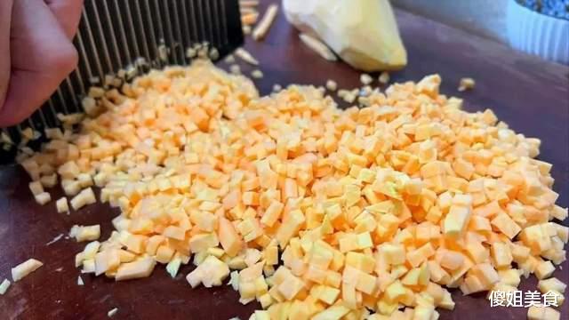 2、切丁有讲究:红薯和肉都切成均匀小丁,不要太大也不要太小,约0.5厘米见方最合适。