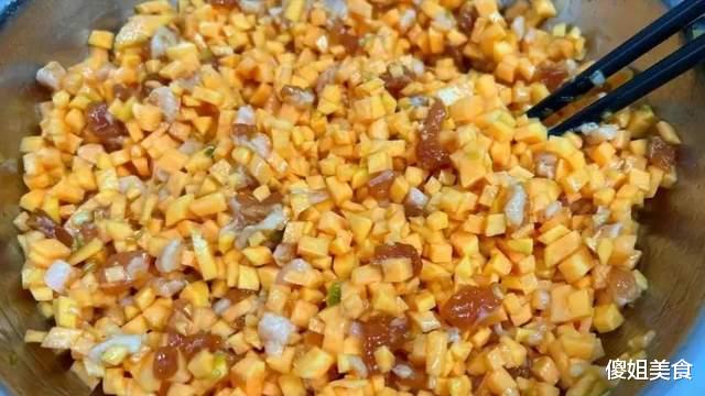 第三步:把红薯丁和腌制好的肉丁混合在一起,加适量食用油搅拌均匀。这时候的馅料就已经散发出诱人的香味了。