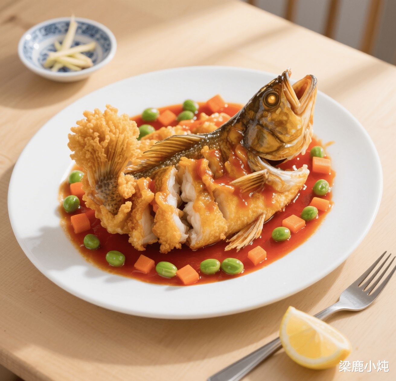 做好的松鼠鳜鱼,造型逼真 —— 鱼头昂起,鱼肉块卷曲如松鼠尾巴,红亮的酱汁裹着金黄的鱼肉,点缀着青豆和胡萝卜丁,视觉上就极具吸引力;入口先是外壳的酥脆,接着是鱼肉的细嫩,没有丝毫腥味,酸甜的酱汁裹着鱼肉,既解腻又开胃,青豆和胡萝卜丁的脆感丰富了口感层次,每一口都酸甜适中、鲜爽可口。